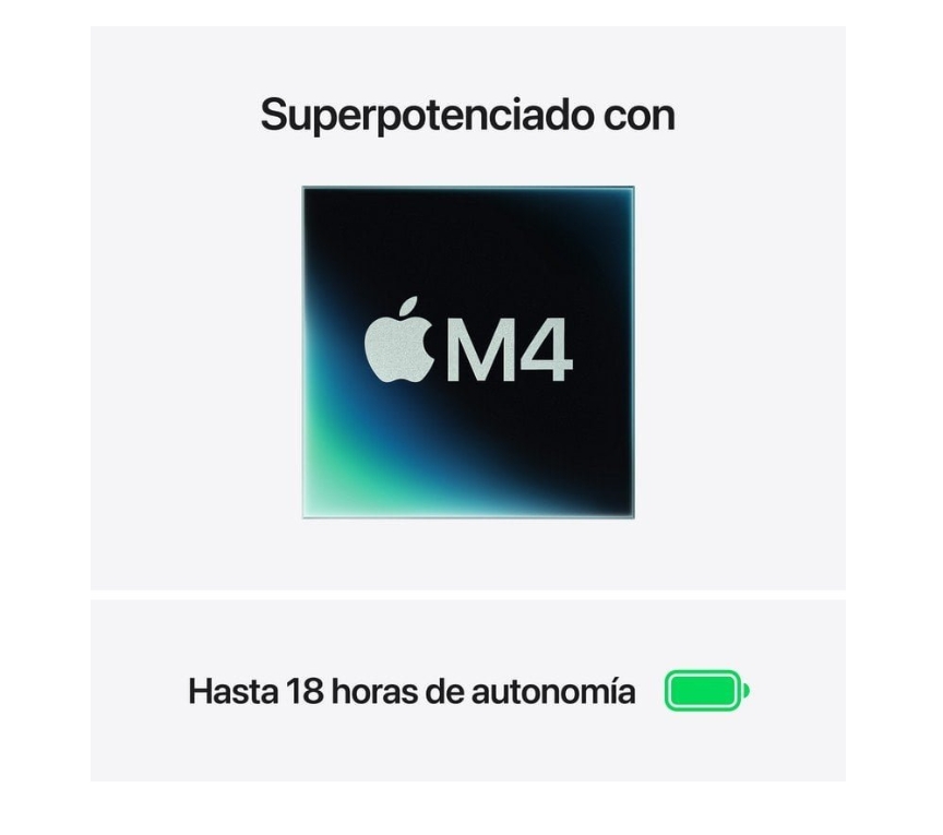 - SUPERPOTENTE COM O M4 — O chip M4 da Apple multiplica a velocidade de tudo o que faz, desde utilizar várias aplicações ao mesmo tempo, editar vídeos ou desfrutar de jogos com gráficos exigentes.