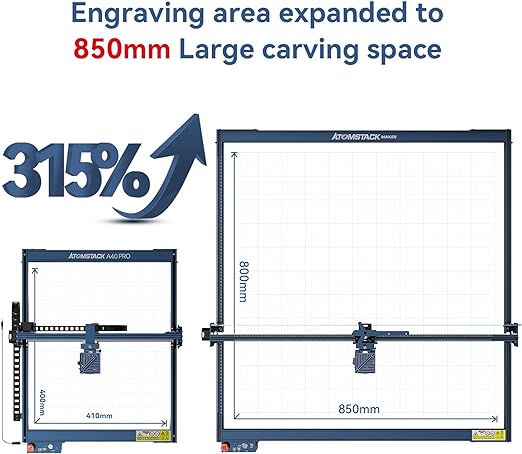 Grande área de trabalho de 850 x 800 mm: basta substituir a estrutura da máquina de gravação da série ATOMSTACK e pode obter uma grande superfície de gravação de 850 x 800 mm sem comprar acessórios adicionais para atender às suas necessidades de gravação em grande escala.