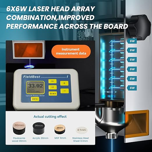 Super alta potência de 33 W: a primeira máquina de gravação a laser de potência ótica de 33 W do mundo. A mais recente tecnologia de acoplamento a laser 6 6 W pode cortar placas de paulownia de 18 a 20 mm, placas acrílicas pretas de 10 mm e lâminas de aço inoxidável de 0,1 mm. O laser de alta densidade pode cortar madeira de 30 mm de espessura e acrílico preto de 40 mm de espessura para várias operações; pode gravar metal de aço inoxidável espelho, cerâmica, vidro opaco, etc.
