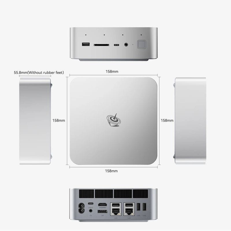 Finalmente, o Beelink GTi12 é um dos modelos mais completos da marca. Dispõe de 5 portas USB 3.0, um espaço para cartão SD, 1 Ethernet 2.5Gbps, 2 jacks de áudio de 3.5 mm, 1 USB Tipo C, 1 DisplayPort 1.4a, 1 HDMI e Thunderbolt 4.