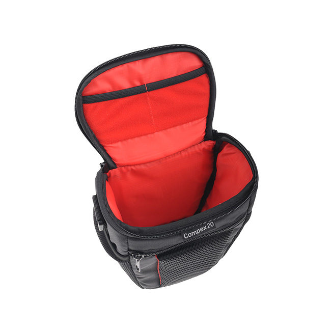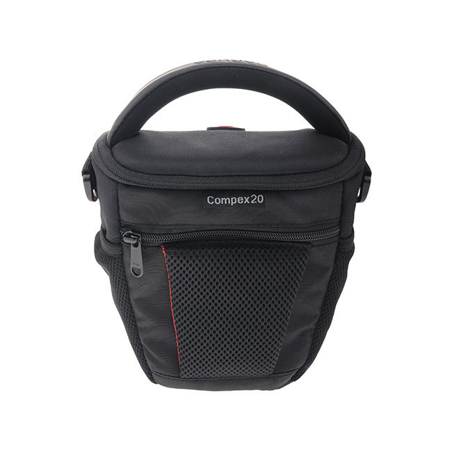 Caruba Compex CP-20 A Caruba Compex CP-20 é uma bolsa de câmera compacta com uma alça grande e robusta na parte superior. Perfeito para armazenar e transportar com segurança uma pequena câmera DSLR com uma lente padrão acoplada. A bolsa pesa apenas 312 gramas, está equipada com uma presilha para cinto e possui uma alça de ombro removível. Uma capa de chuva especial também está incluída.