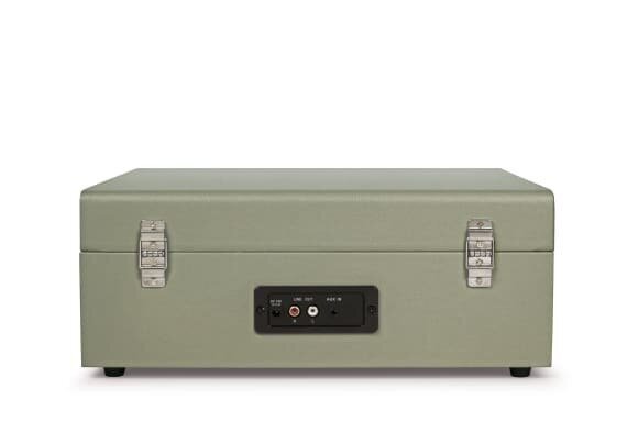 Mesa giratória de 3 velocidades (33 1/3, 45 e 78 RPM) Look vintage Motor de acionamento de correia Receptor Bluetooth embutido Alto-falantes estéreo embutidos - 5 W Fone Saída RCA Aux em Alavanca de sinalização Controle de passo ajustável Dimensões: 26,70 x 35,60 x 11,80 cm Peso: 2,9 kg Cor: Sage