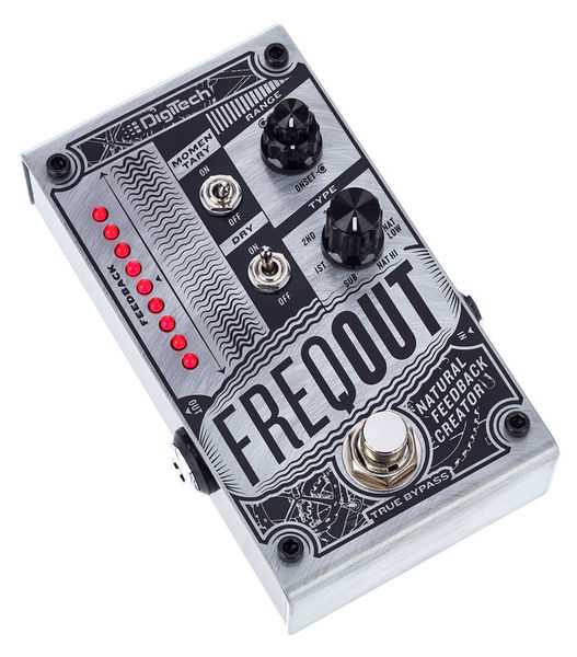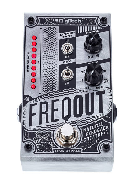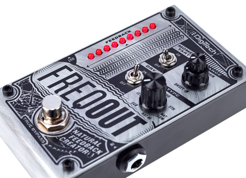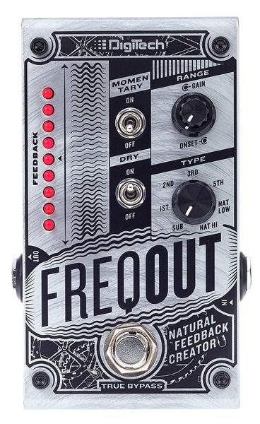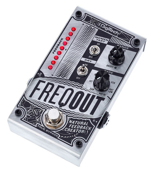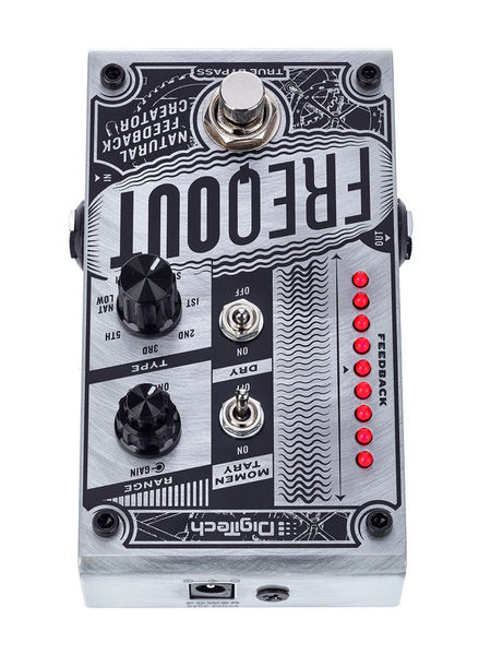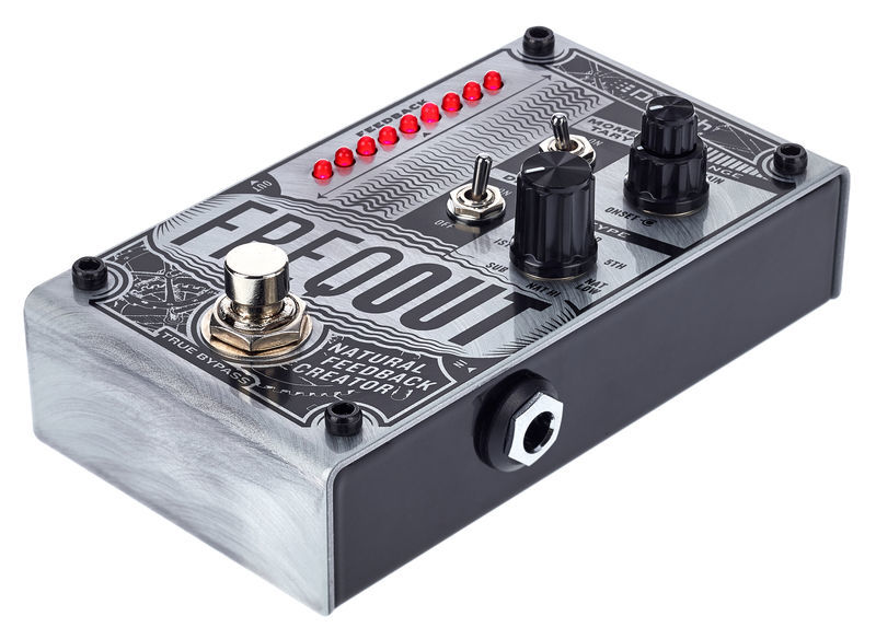 Pedal de efeito para guitarra elétrica Gerador de feedback Produz feedback natural em qualquer volume, com ou sem distorção 7 Tipos de feedback harmônico True Bypass Controles para início e ganho Discagem tipo de 7 vias para selecionar entre os modos 1, 2, 3, 5, Nat Low, Nat Hi e Sub feedback Interruptor de alavanca momentâneo para mudar o pedal do travamento para o modo momentâneo Interruptor de alavanca seca para ligar / desligar o sinal seco Interruptor de pedal de derivação 6,3 mm Mono lâminas in / out LEDs de status Invólucro metálico Fonte de alimentação via fonte de alimentação de 9 V DC (plugue oco de 2,1 x 5,5 mm, polaridade: (-) interna, não incluída) Consumo atual: 235 mA Dimensões (C x L x A): 121 x 73 x 45 mm Peso: 370 g