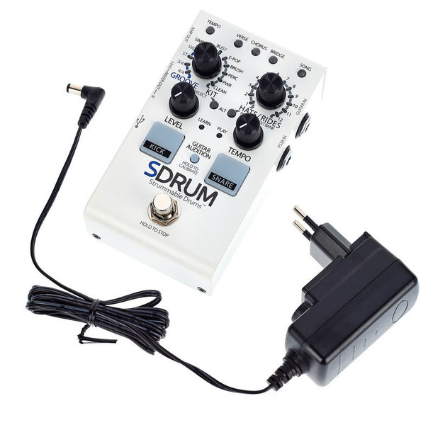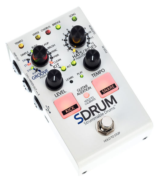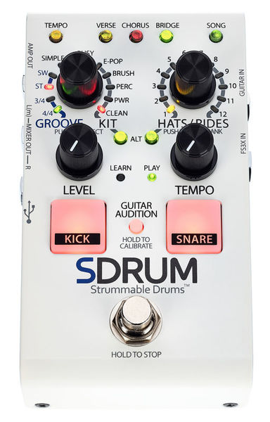 Computador de bateria no formato Stompbox Cria ritmos de bateria com base em arranhões e strums sobre as cordas silenciadas 5 sons de kit de bateria com qualidade de estúdio 12 estilos diferentes de chapéus / passeios Armazene até 36 músicas diferentes Cada 3 partes de música programáveis Pads para tocar bumbo e tarola Controles de nível e andamento Interruptor rotativo Groove / Kit para selecionar assinatura de tempo, toque, kit e enfeites Chave rotativa Hats / Rides para selecionar os estilos de chapéu / passeio Botão de controle Guitar Audition / Calibrate Botão de controle de tempo Botões de controle de parte (verso, coro, ponte) para selecionar partes da música Botão de controle de música para acessar padrões de música salvos Botões de controle alternativo para selecionar sons alternativos do kit Carcaça de metal LEDs de status Pedal de desvio Entrada / saída de 6,3 mm 2 saídas de mixer de 6,3 mm (L / R) Mini porta USB para atualizações de firmware Entrada JamSync de 3,5 mm para sincronizar com outros dispositivos habilitados para JamSync Entrada TRS de 6,3 mm para o pedal DigiTech FS3X Fonte de alimentação via adaptador de alimentação incluído de 9 V (DigiTech PS0913DC) (conector de barril de 5,5 x 2,1 mm e polaridade (-) interna), operação com bateria não suportada Dimensões (C x L x A): 140 x 85 x 65 mm Peso: 500 g