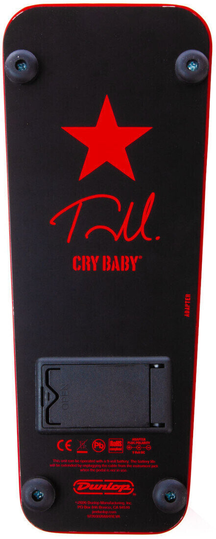 O Tom Morello Cry Baby® Wah pode ser alimentado por um adaptador Dunlop ECB003 de 9 volts, ou o DC BrickTM, Iso-BrickTM e Mini Iso-BrickTM fontes de alimentação (não incluídas).