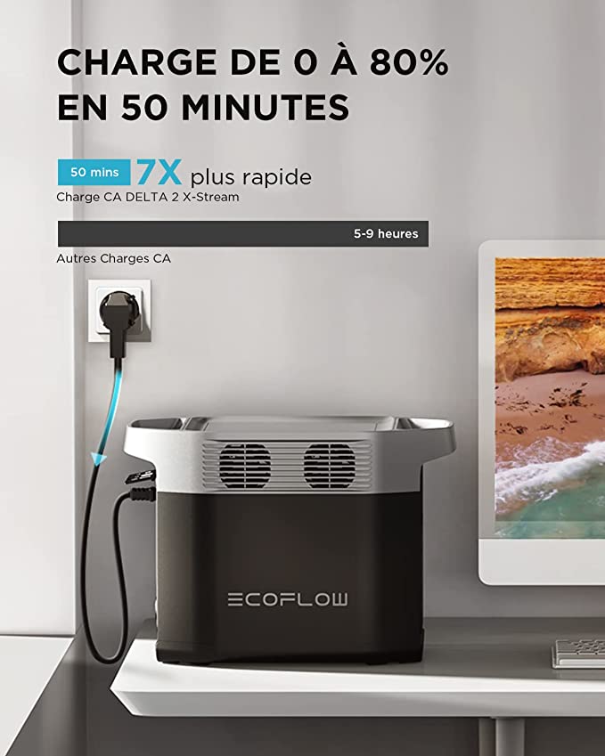 Carregamento 7 vezes mais rápido: um gerador solar que carrega rapidamente. Passa de 0 a 80% em 50 minutos. É ideal quando precisa de energia de reserva em casa e de um carregamento rápido com a tomada.