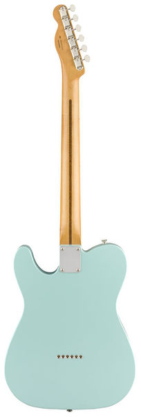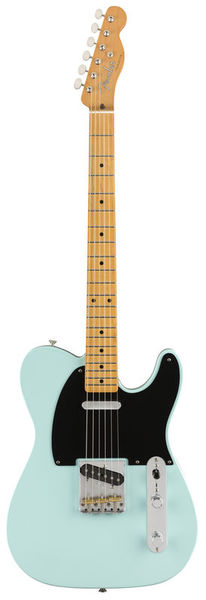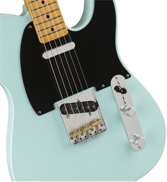 Guitarra elétrica Série Vintera Body: Alder Parafuso de aperto: Maple Fretboard: Maple Embutimentos de escala de ponto preto Perfil do pescoço: Grosso macio V Escala: 648 mm (25,5 ") Raio do braço da guitarra: 184 mm (7,25 ") Largura da porca: 42 mm (1,65 ") Porca de osso sintético 21 trastes enormes Captadores: Bobina Tele Tele Personalizada Estilo Vintage (ponte) e Bobina Tele Torcida Custom Shop (braço) Botão de volume principal, botão de tom principal Interruptor S-1 Interruptor de alavanca de 4 vias Ponte de estilo vintage com cordão através do corpo e 3 selas de latão Pickguard preto de camada única Cabeças de máquina de estilo vintage Hardware de níquel / cromo Encordoamento de fábrica: Fender USA 250L NPS .009 - .042 (artigo no. 133191) Cor: Daphne Blue Saco de show de luxo incluído