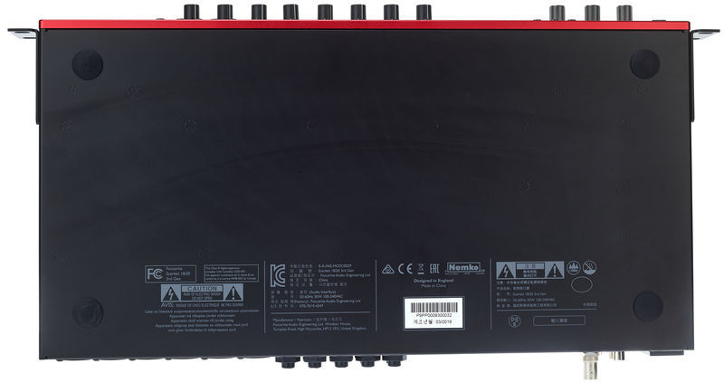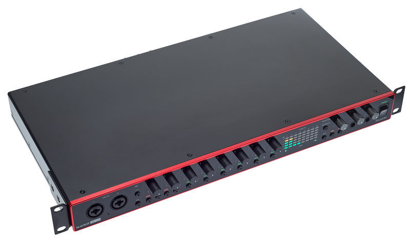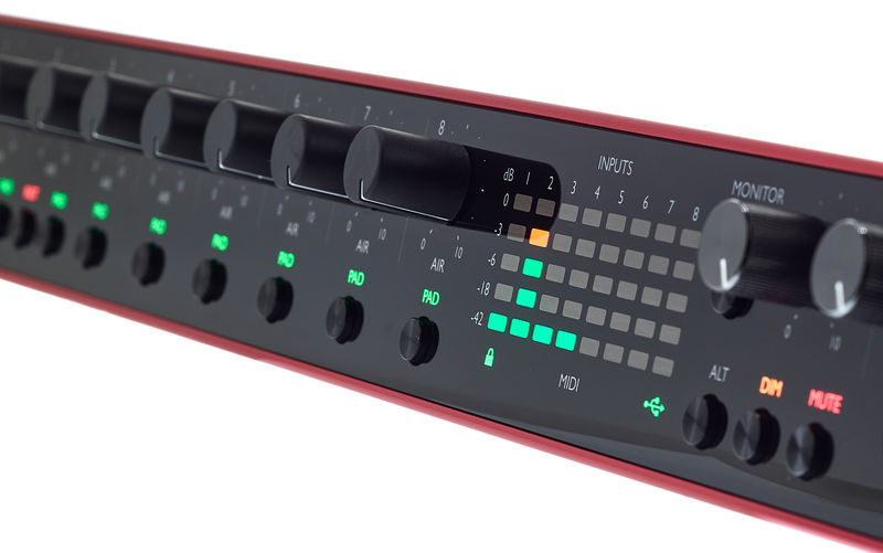 24 bits / 192 kHz 8 pré-amplificadores de microfone Scarlett Alimentação fantasma +48 V Função de ar comutável Função Talkback com microfone integrado Pad switch 8 entradas Mic / linha: combo XLR / 6,3 mm com balanceamento - 2 deles na frente com entrada de instrumento 10 saídas de linha: jack de 6,3 mm balanceado 2 saídas de fone de ouvido estéreo: tomada de 6,3 mm 2 entrada / saída S / PDIF coaxial 2 entrada e saída ADAT Entrada e saída MIDI Conexão USB-C BNC Word Clock Para PC / Mac Formato: 19 "/ 1U (painel removível do rack) Dimensões (L x A x P): 482,6 x 46,6 x 259,8 mm Peso: 3,19 kg Inclui cabo USB (tipo C a A) e Ableton Live Lite, Pro Tools First, suíte de plug-in Focusrite Red 2 e Red 3, pacote Softube Time & Tone e uma ferramenta de software de 4 teclas viciantes de áudio XLN de sua escolha