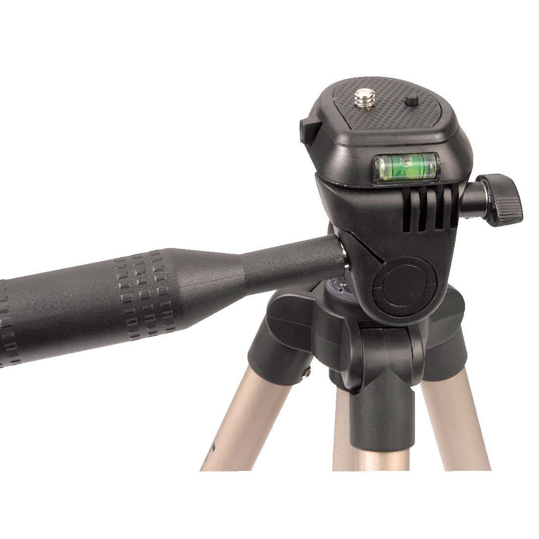 Você precisa de uma altura extra? Então você também pode estender a coluna do meio. Com a cabeça de tripé de três direções, você pode colocar sua câmera em qualquer posição desejada. Os pés de borracha fornecem uma aderência estável na superfície.