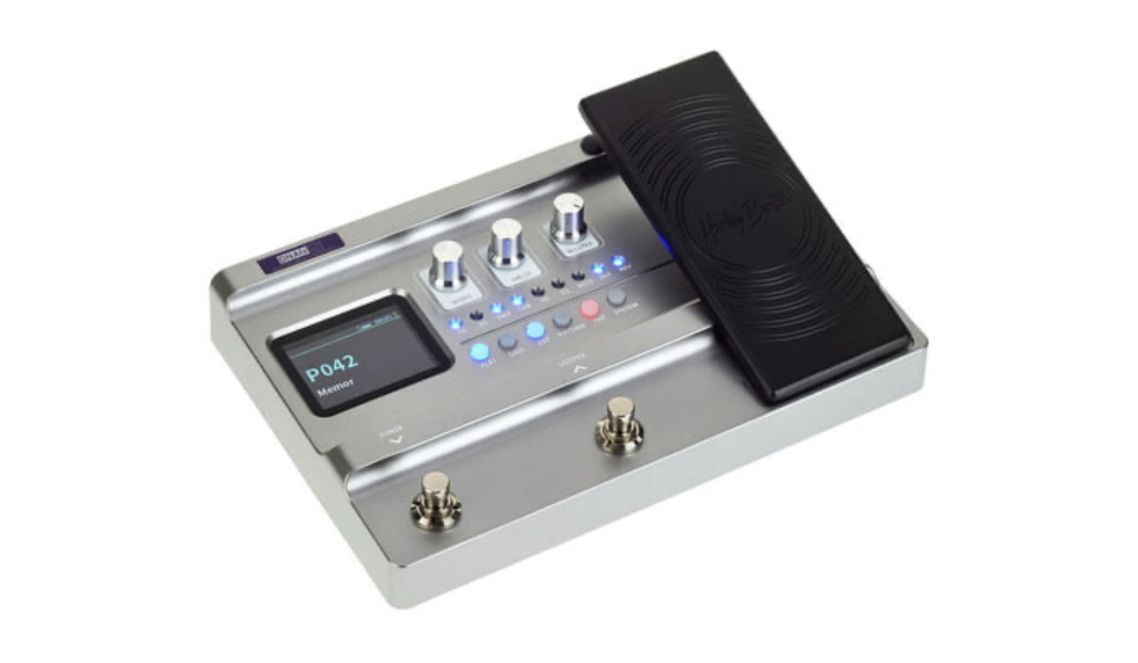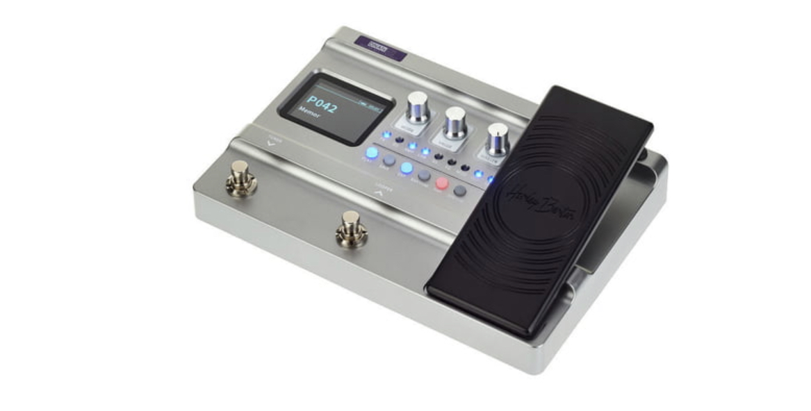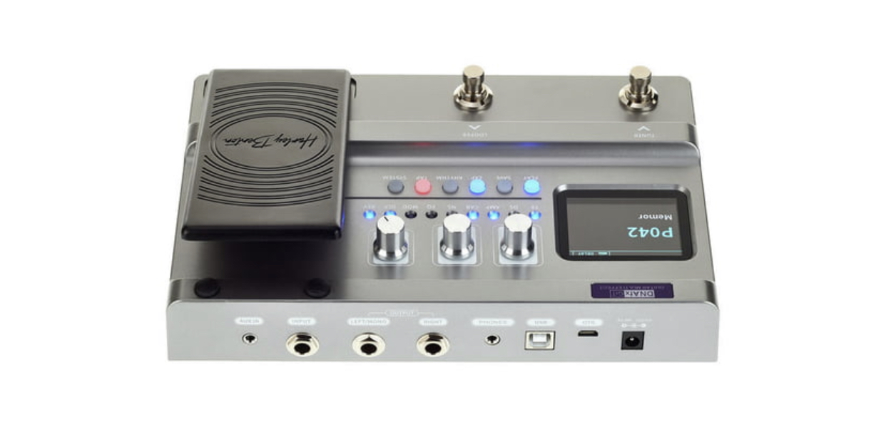 Harley Benton DNAfx GiT, advanced amp modeling & multi-effect processor for electric guitar, 55 classic & modern high-quality guitar AMP models that utilize non-linear digital amp modelling technology (giving a real tube amp tone, feel & response), 26 IR classic & modern guitar speaker cabinet model simulations (impulse response) w/added support for 3rd party IR files, 151 different high-quality built-in classic & modern guitar effects (drives, compressors, noise gates, EQ´s, modulation, wah, pitch, filters, delays, reverbs & much more) up to 9 types of effects simultaneously, integrated expression pedal for easy adjust of effect parameters on-the-fly, up to 200 store and recall preset patches, tap tempo function, 80 second phrase looper, modern drum machine w/40 drum patterns & 10 metronome rhythms, easy read LED chromatic tuner (435-445hz), USB connectivity for PC/MAC editing, direct audio recording (DAW) & software updates, outputs are programmable for easy integration with any live & studio setup, headphone output and aux input for playback and easy practice sessions, OTG function supports smart phone & tablet software for direct audio/video recording & live streaming, big easy read LED color display, sturdy housing with ABS top and aluminum bottom, input: 6,3mm mono jack, output L/R: 6,3mm mono jack, aux in: 3,5 mm stereo jack, headphone output: 3,5mm stereo jack, OTG port: micro USB, USB port: type B USB, sampling rate: 44,1 kHz, sampling accuracy: 24 bit, power supply: DC 9V 300mA (included), dimensions: 230x156x33mm, weight: 1 kg; editor software for Win / Mac can be downloaded in the download section on the bottom of this page