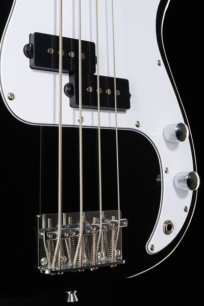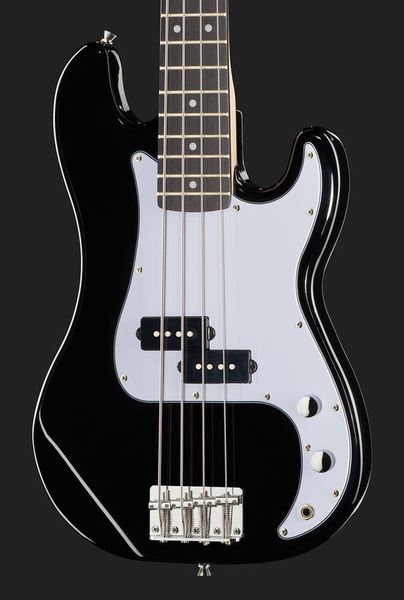 Baixo elétrico de escala curta Série padrão Corpo: Poplar Pescoço aparafusado: Maple Fretboard: Amaranth Fretboard inlays: pontos Perfil do pescoço: C moderno 19 trastes Escala: 762 mm Largura da porca: 42 mm Treliça de dupla ação Pickup: 1 bobina dividida estilo PB 1 controle de volume e 1 controle de tom Hardware Chrome Cabeças de máquina clássicas de estilo PB Encordoamento de fábrica: 0,040 - 0,095 Cor: Preto alto brilho Gigbag adequado: Artigo no. 142777 (não incluído) Cordas adequadas: Artigo no. 205074 (não incluído)