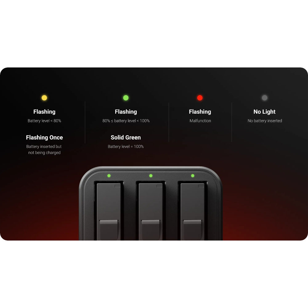 Carregue até 3 baterias ao mesmo tempo para sua câmera Insta360 Ace ou Ace Pro com este Insta360 Ace Pro 2 / Ace Pro Fast Charge Hub. Com um tempo total de carregamento de apenas 53 minutos, você pode voltar ao trabalho rapidamente. Os indicadores LED mostram o status de cada bateria, para que você possa monitorar facilmente o processo de carregamento. Conecte o hub a uma fonte de alimentação com o cabo USB-C incluído.