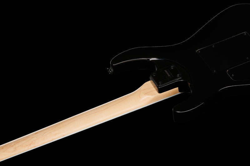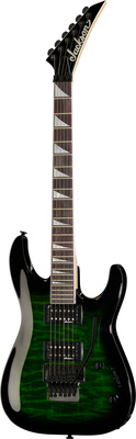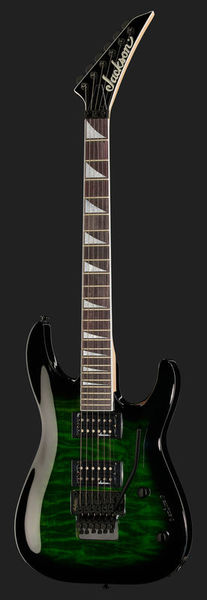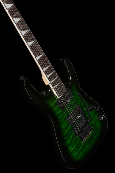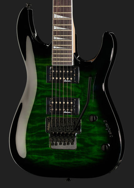 jackson JS32Q DKA Dinky Arch Top AH TGB, guitarra elétrica dinky; corpo: álamo; topo: colcha de bordo; pescoço: bordo; escala: amaranto; montagem no pescoço: aparafusada; incrustações: sharkfin pearloid; 24 trastes enormes; porca: Floyd Rose licenciou o bloqueio de Jackson; largura da porca: 43 mm (1,69 "); escala: 648 mm (25,51"); raio do braço: raio composto de 305 mm (12 ") a 406 mm (16"); captadores: humbucker de alto rendimento Jackson (ponte), humbucker de alto rendimento Jackson (braço); controles: volume, tom; interruptor: de três vias; tremolo: Floyd Rose licenciou o bloqueio duplo de Jackson; acabamento de hardware: preto; afinadores: Jackson selado sob pressão; cor: explosão verde transparente; seqüências de ações: NPS .009 - .042