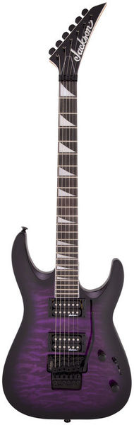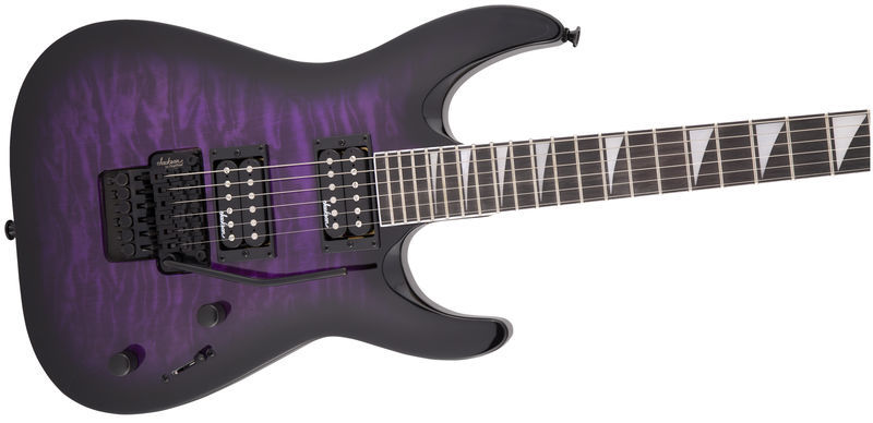 Jackson JS32Q DKA Dinky Arch Top AH TPB, guitarra elétrica dinky; corpo: álamo; topo: colcha de bordo; pescoço: bordo; escala: amaranto; montagem no pescoço: aparafusada; incrustações: sharkfin pearloid; 24 trastes enormes; porca: Floyd Rose licenciou o bloqueio de Jackson; largura da porca: 43 mm (1,69 "); escala: 648 mm (25,51"); raio do braço: raio composto de 305 mm (12 ") a 406 mm (16"); captadores: humbucker de alto rendimento Jackson (ponte), humbucker de alto rendimento Jackson (braço); controles: volume, tom; interruptor: de três vias; tremolo: Floyd Rose licenciou o bloqueio duplo de Jackson; acabamento de hardware: preto; afinadores: Jackson selado sob pressão; cor: explosão roxa transparente; seqüências de ações: NPS .009 - .042