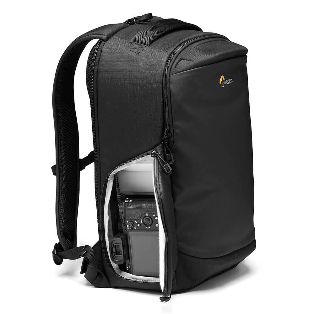 O acesso traseiro aprimorado proporciona acesso rápido e fácil ao compartimento da câmera, mantendo seu equipamento protegido com segurança em terrenos acidentados. Basta tirá-lo de suas costas, colocá-lo para baixo e abrir o painel traseiro para acesso total ao seu equipamento. O acesso lateral fornece um segundo ponto de acesso para a rápida troca de lentes.