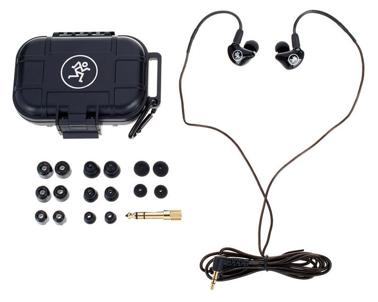 Inclui estojo rígido, adaptadores de jack de 3,5 mm a 6,3 mm banhados a ouro, pontas dos ouvidos em espuma, silicone e flange dupla em 3 tamanhos cada