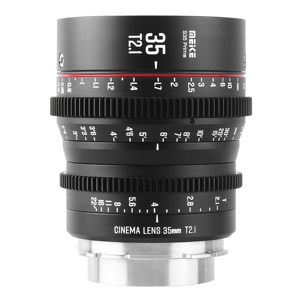 O Meike MK-35mm T2.1 S35 Prime Cine Lens foi projetado com um círculo de 33,6 milímetros para cobrir completamente o sensor de câmeras Super35, tornando-o adequado para fotografar com uma resolução de 6K. Possui foco Cine-standard 0.8 MOD e anéis de dentes diafragma.