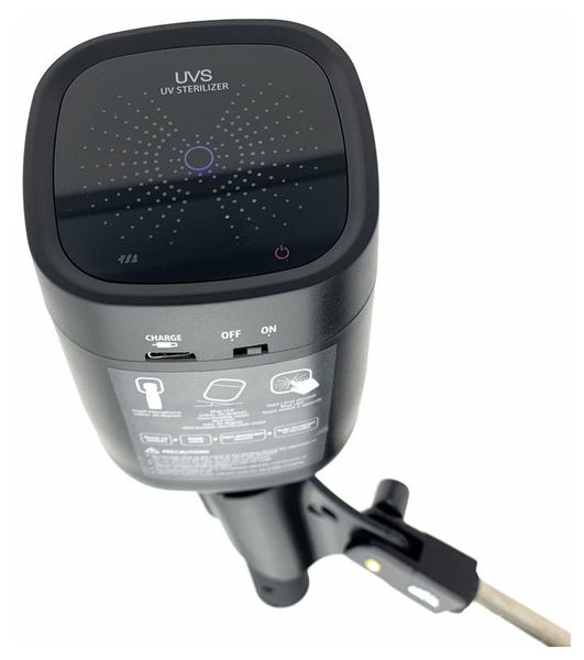 Esterilizador de microfone Micker Pro UVS-01; O esterilizador UVS desinfeta e desodoriza os microfones usados usando radiação UV; bactérias e vírus são eliminados para 99,9% e os odores são reduzidos; esterilizador de microfone operado por bateria; sem química: não cheira, não ataca componentes; operação com bateria para liberdade de movimento irrestrita; comprimento de onda: UVC 254nm; intensidade de radiação: 300 µm / cm²; tempo de esterilização: 5 minutos por microfone; bateria: 3.7V 420mA; tempo de carregamento: 2 horas, 5V / 300mA; consumo de energia: 5W; dimensões internas, aprox .: 65x65x75mm; dimensões externas (LxPxA): 80x80x110mm; peso: 0,2 kg; incl. Cabo de carregamento USB USB-C