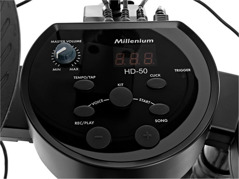 Conjunto de E-Drum Millenium HD-50 Conjunto de bateria elétrica Conjunto de bateria elétrica compacta de nível básico Almofadas e pedal controlador totalmente integrados ao suporte Conexões: entrada para fone de ouvido, USB, entrada AUX Dimensões (L x P x A): 75 x 50 x 100 cm Pads e hardware: