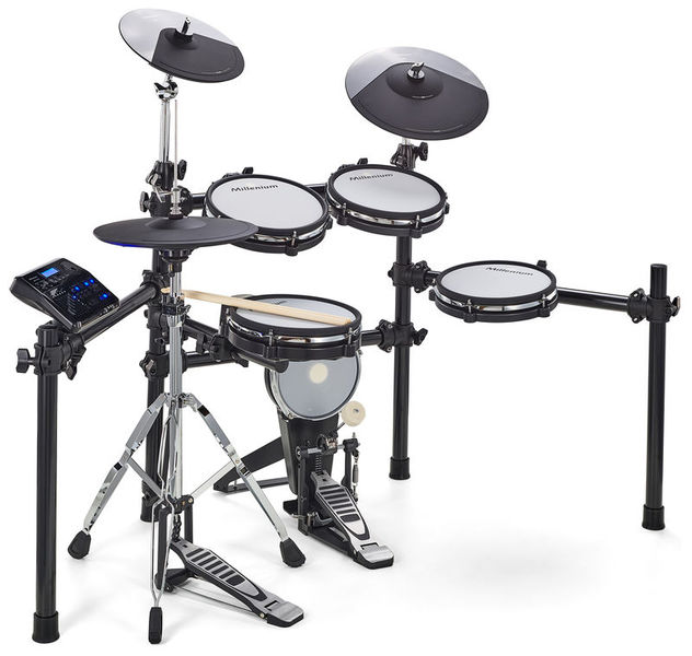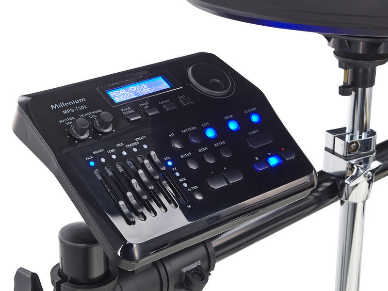Conjunto de malhas de bateria eletrônica Millenium MPS-750X, conjunto contendo 1x pad de tarola de malha de zona dupla de 10 ", pads de tom de malha de zona dupla de 10", pad de chute de cabeça de malha de 8 "com pedal, pad de chimbal de 1x 10" com controlador montado no suporte, 1x pads de impacto de zona dupla de 12 "com afogador, pad de condução de zona tripla de 14" com afogador, controlador de chimbal, módulo de bateria MPS-750 com 20 predefinições e 20 kits de usuário, 697 sons, 55 músicas, equalizador de 4 bandas, Faders para ajustar o volume do pad, efeitos ou equalizador, Saída de linha (E / D), Saída de fone de ouvido, Entrada de linha, USB, duas entradas adicionais de pad, Bluetooth, rack de bateria incluso, suporte para chimbal, pedal, pedal, fonte de alimentação, cabos e sticks ,