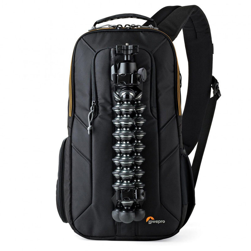 No compartimento especial da câmera, você pode armazenar uma câmera SLR com uma lente acoplada e algumas lentes soltas. O interior deste compartimento é macio e equipado com divisórias móveis. Assim, você pode personalizar completamente o Slingshot Edge 250 AW. Existem também compartimentos especiais para cartões de memória, baterias, filtros e outros pequenos acessórios. Mas isso está longe de tudo; há também um compartimento principal que oferece espaço suficiente para itens pessoais. A Lowepro Slingshot Edge 250 AW também possui tiras na frente que permitem a conexão de um tripé compacto e há espaço para um tablet como o iPad da Apple.