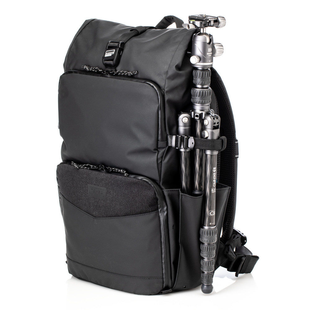 Há um encarte na bolsa no qual você pode guardar seu equipamento fotográfico. Com divisórias, você pode organizar a inserção conforme desejado. A inserção é removível, então você também pode usar a mochila para transportar roupas ou acessórios. A bolsa também possui um compartimento para sua garrafa de água e suportes para um tripé.