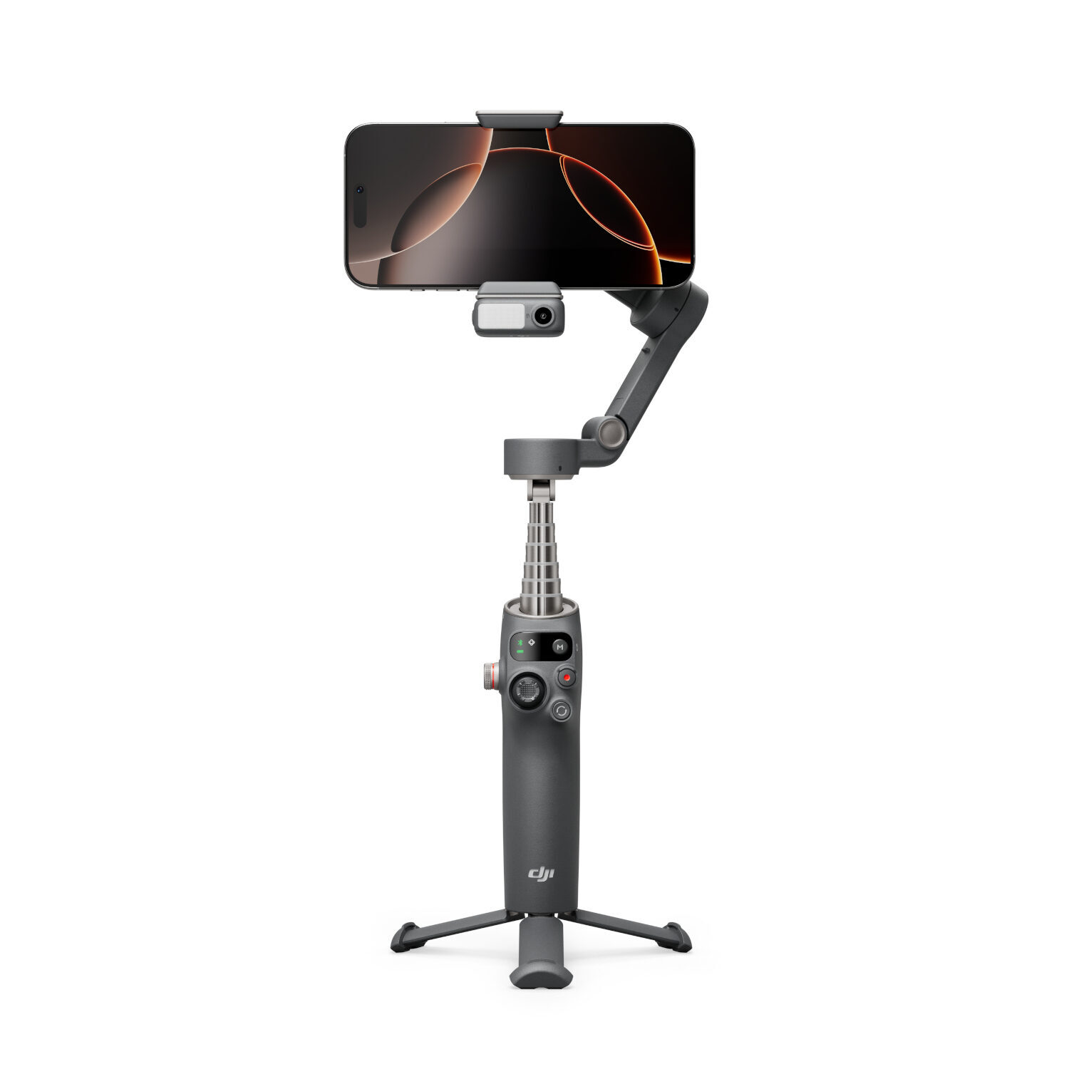 O Osmo Mobile 7P possui um poste de extensão embutido e um tripé integrado. Isso oferece opções mais criativas, desde fotos de grupo até ângulos dinâmicos para seus vlogs. Além disso, o gimbal fornece iluminação com brilho e temperatura de cor ajustáveis, ideal para situações de pouca luz. Para um som nítido e nítido, você pode emparelhar o DJI Mic Mini.