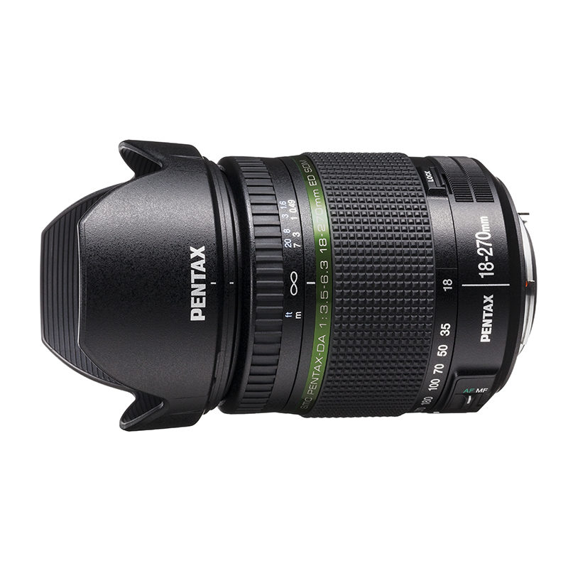 Pentax DA 18-270mm f/3.5-6.3 SDM K-mount lens A lente pentax DA 18-270mm f/3.5-6.3 SDM K-mount é uma lente de zoom abrangente com uma faixa de zoom de 15x de 18mm grande angular a zoom telefoto de 270 mm. Para garantir a qualidade da longa gama da lente, dois elementos de dispersão de camada extra foram incluídos na construção da lente para reduzir a aberração cromática e melhorar o brilho geral da imagem. Com uma distância mínima de foco de 45 centímetros sobre toda a faixa de zoom, a lente é muito adequada para trabalhos macro e close-up.
