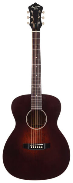 Gravação King ROS-11-FE3-TBR Todos os sólidos 000 A / E Guitarra; Violão; Série 11; Costas e laterais: mogno africano sólido; topo: sitka spruce sólido; pescoço: mogno; Perfil do pescoço em C; escala: Padauk; Marfim Dots Inlays, 20 trastes; noz: osso; largura da porca: 44 mm (1,73 "); escala: 632 mm (24,9"); ponte material: Padauk; encadernação: marfim; Captadores: Fishman Sonitone; Cabeças da máquina: engrenagem aberta, botão de marfim; Padrão de órtese superior: X recortado; Cor: Cetim Brownburst transparente