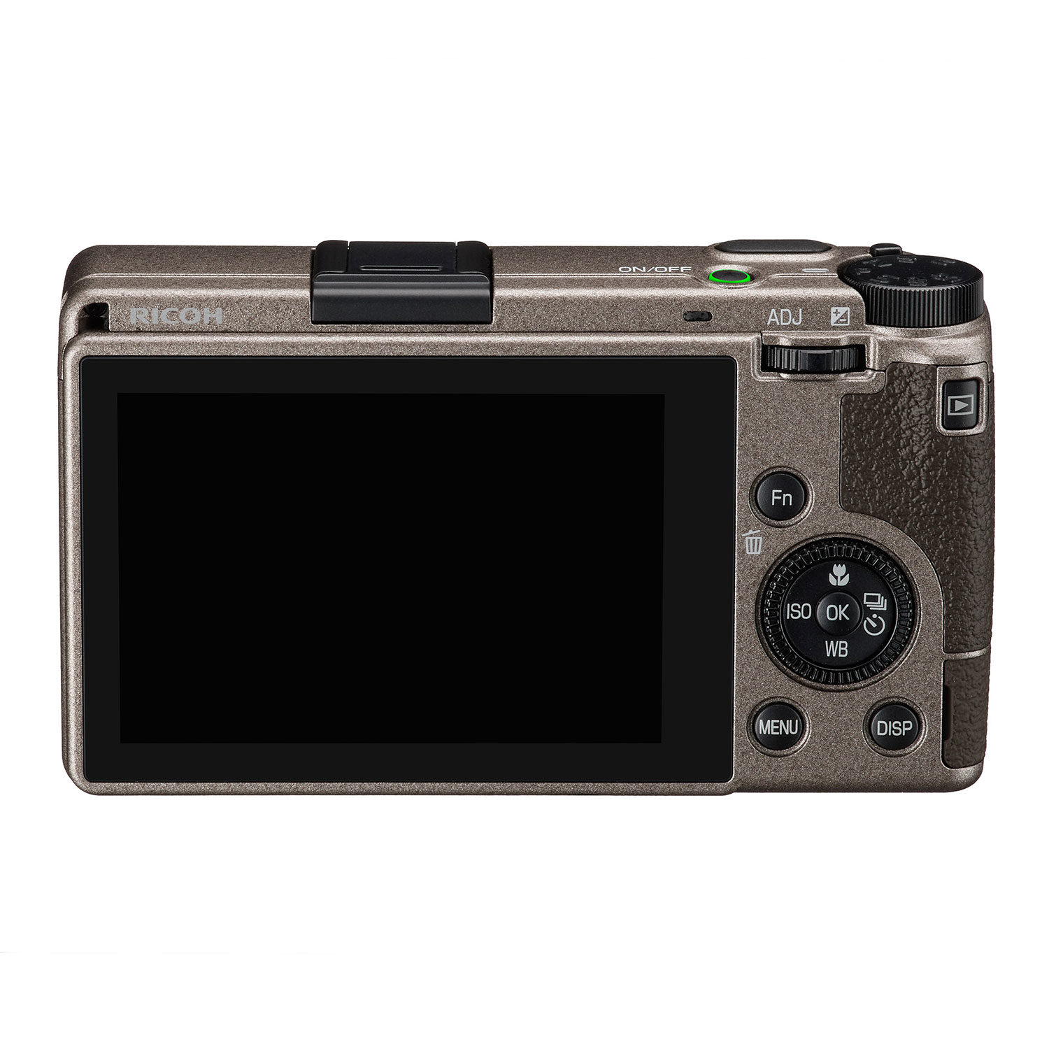 Quando desligado, o Ricoh GR III Diary Edition exibe uma tela de fechamento exclusiva em relevo com o logotipo do produto contra um fundo com um efeito de textura empoeirada e uma cor que combina com o acabamento do corpo da câmera.