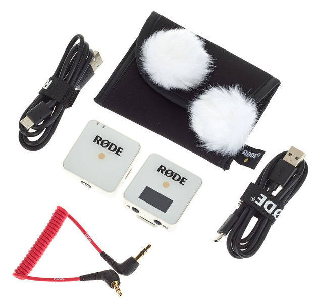 Rode Wireless GO Branco; Sistema de microfone digital sem fio; conjunto ultracompacto e leve de transmissor e receptor; transmissão digital de 2,4 GHz série III; transmissor de encaixe TX com microfone embutido (cápsula omni); SPL máximo: 100 dB; Faixa de frequência: 50 Hz - 20 kHz (microfone interno); Conector TRS de 3,5 mm para microfone externo; alcance do transmissor: até 70 m (com base no ambiente ideal); receptor clip-on RX com suporte para sapata da câmera; RX com bloco de saída selecionável de 3 níveis (0 dB, - 6 dB, -12 dB); bateria LiPo recarregável incorporada (TX e RX); duração da bateria: máx. 7 horas; cobrado via USB-C; até 8 sistemas podem ser usados simultaneamente; incluído: cabo TRS 3,5 mm SC2, 2 pára-brisas peludos, 2 cabos USB (A a C), bolsa de armazenamento; cor branca; dimensões (cada): 44 x 46,4 x 18,5 mm; peso (cada): 31 g