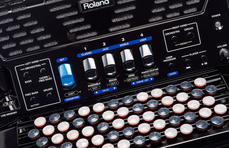 Acordeão Sensibilidade à velocidade de 62 teclas 72 botões graves sensíveis à velocidade 128 Polifonia de voz Footble reed footages 4 Footage canas 5 7 conjuntos de acordeões com 8 registros agudos, 16 sons de orquestra, 3 registros de baixo, 3 registros de orquestra de baixo, 5 registros de acordes de orquestra e 8 memórias de registro A replicação do acordeão soa como foles e juncos Telão LED Novo sensor de fole Porta USB para armazenamento de mídia MP3 e Wave Player Efeitos como reverb e coro Afinação de musette Controle em tempo real do volume Porta de fone de ouvido Saída de linha MIDI IN / OUT selecionável Funcionamento com pilhas recarregáveis Ni-MH (AA) Alto-falantes: 2 x 7 Watt Peso: 6,5 kg Dimensões (A x L x P): 405 x 365 x 195 mm Cor: preto Inclui: Alça de transporte e adaptador de energia (PSB-230EU)