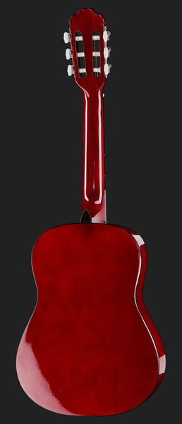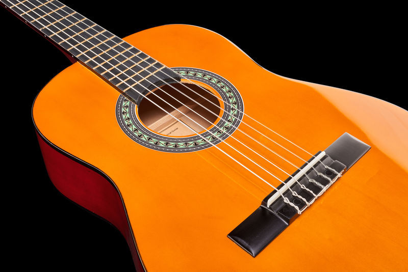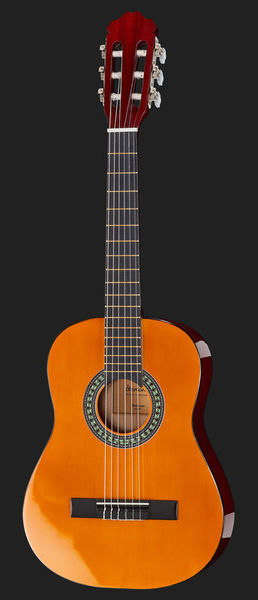 Guitarra clássica Tamanho: 1/2 Corpo de Basswood Pescoço da Otan Braço de bordo Escala: 550 mm Largura da porca: 45 mm Encadernação de corpo preto Cordas de nylon Comprimento total: 86,36 cm Cor: marrom claro fosco