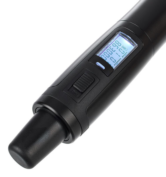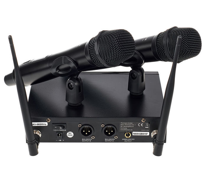 Sistema sem fio UHF de 2 canais com transmissor de mão Banda de frequência: 863 - 865 MHz Cápsula dinâmica Diretividade: Supercardióide Faixa de frequência: 50 - 16.000 Hz 4 grupos de frequência pré-programados, cada um com 4 canais Silenciador automático Varredura de frequência no receptor Saída AF ajustável 10 mW de potência do transmissor Configuração de transmissão por infravermelho do receptor para o transmissor Tom piloto Grade de frequência de 25 kHz Tipo de modulação F3E Visor LC 2x conexão BNC para antenas 2x saída XLR 1x saída de jack Opera com fonte de alimentação de 12V 0.5A DC (+ interna) Transmissor de mão dinâmico com caixa de metal e visor LC Transmissor de mão com 2 pilhas AA ou pilhas recarregáveis Caixa de 9,5 "/ 1U Inclui suporte para microfone, antenas, fonte de alimentação da UE, kit de rack para montagem de um receptor na caixa de 1U