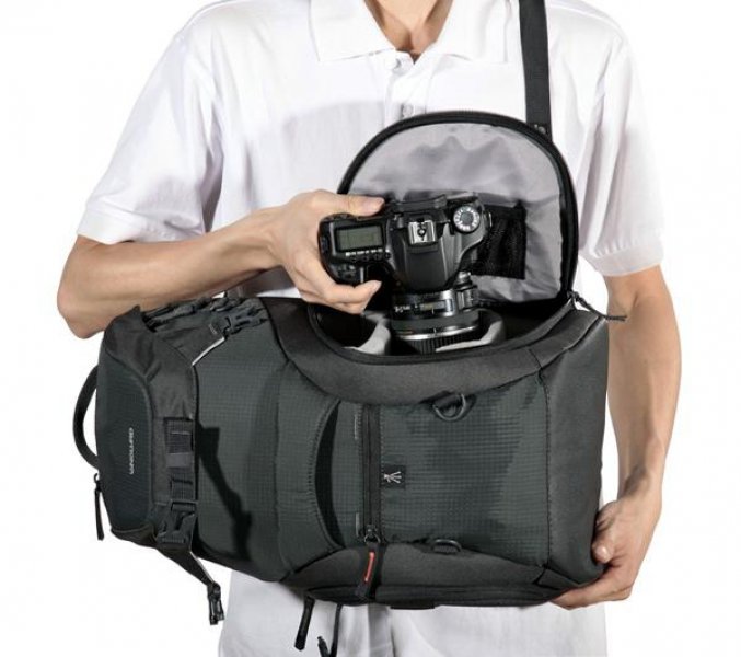 A mochila Vanguard Adaptor 45 dispõe de argolas e passadores para os acessórios. Ela possui ainda um compartimento superior com zip e argolas para arrumar bens pessoais e bolsos com rede que podem conter cartões de memória.