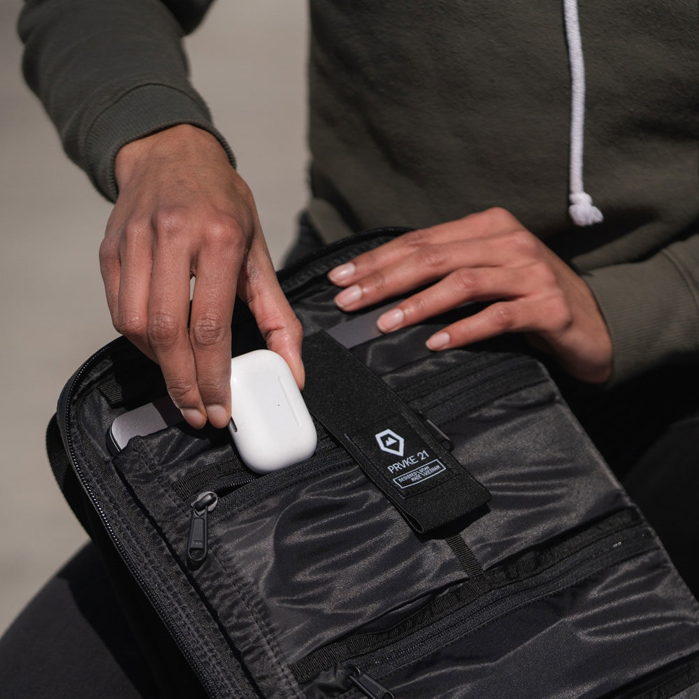 No Varinha O V3 prvke de 31 litros, o bolso forrado de lã foi atualizado anexando-o ao ponto de acesso de aba do compartimento superior e invertendo a direção de abertura para que ele não fique mais no caminho quando você abre o compartimento superior do saco.