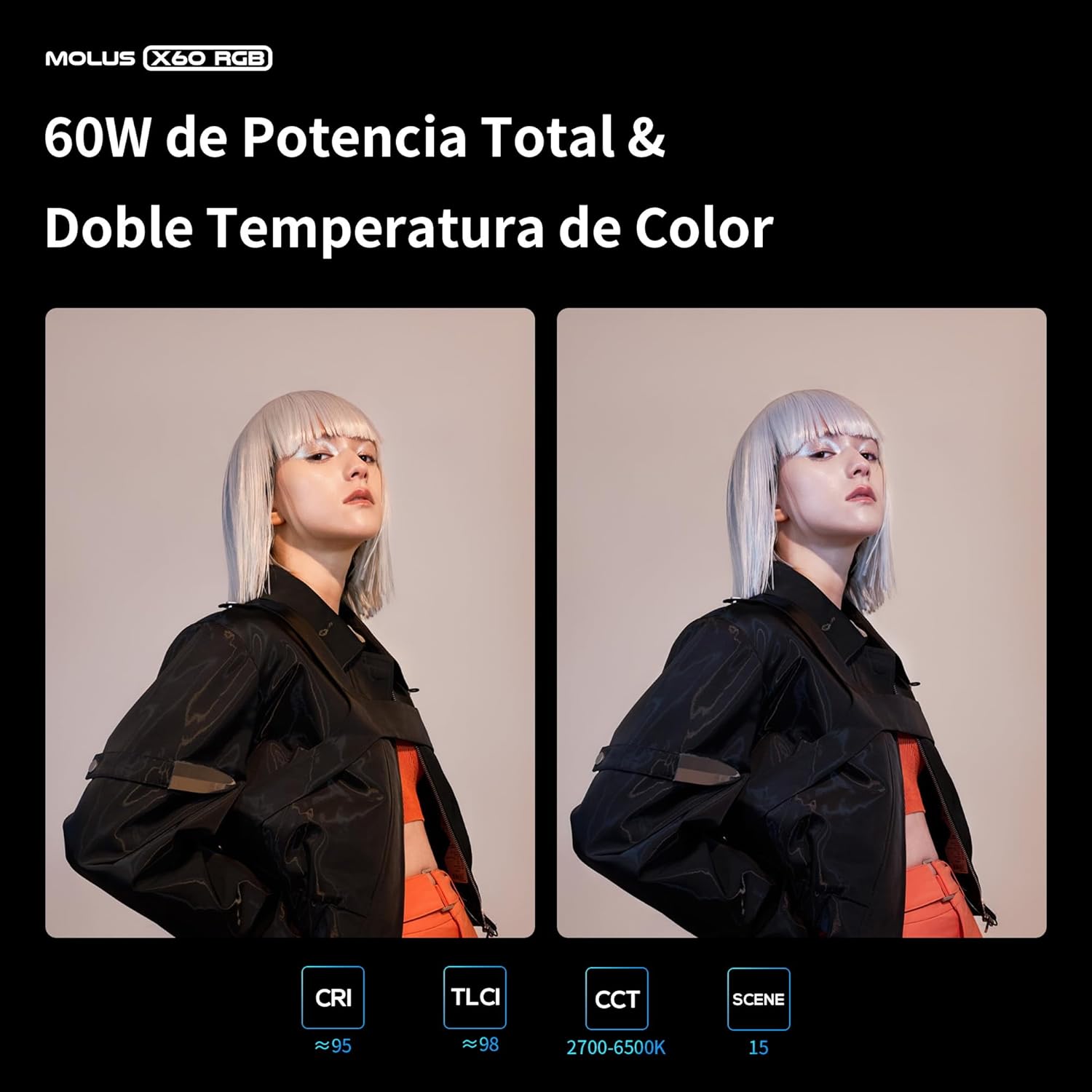 [Pequeno, leve, mas brilhante] ZHIYUN Molus X60 RGB luz vídeo do tamanho da palma da mão pesa apenas 319 g, mas oferece uma potência robusta de 60 W (2010 Lux, CRI 95, TLCI 98) de qualidade profissional que suporta RGB e regulação HSI, ajuste de CCT de 27 00 K a 6500 K. Com os 15 efeitos de luz incorporados do ZHIYUN X60 RGB luz vídeo, criar obras-primas visuais não é nenhum esforço.