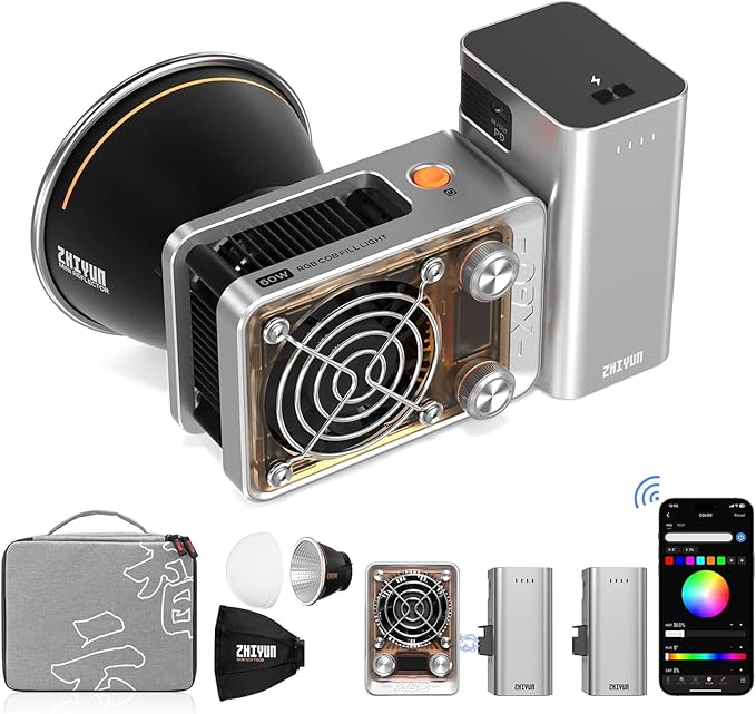 [O que recebe] ZHIYUN Molus X60 RGB luz de vídeo, duas baterias de 2550 mAh aderência, cabo de carregamento 60 W PD, saco de armazenamento, ZY Mount softbox, ZY Mount difusor, ZY Mount refletor, adaptador de CC cabo, bolsa para adaptador CC, guia Início rápido.