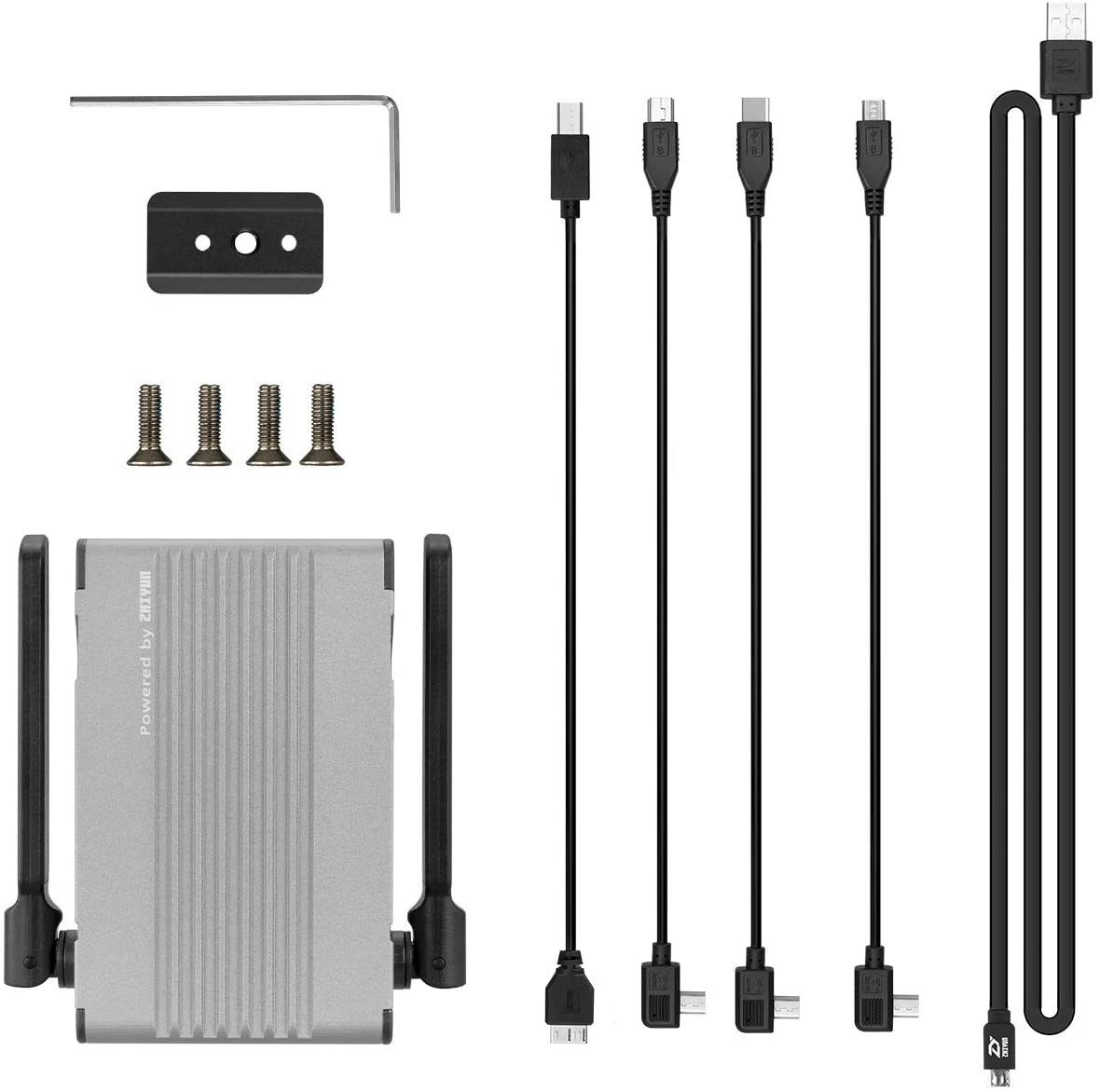 Conteúdo da entrega: Transmissor de imagem Zhiyun, 1 placa de montagem do transmissor, 1 cabo de controle de câmera ZW-Micro-002, 1 cabo de controle de câmera ZW-Mini-002, 1 cabo de câmera LN-MCUS-A03, 1 cabo micro USB x1, parafuso M2. 5 x 9, M1.5. Chave inglesa. 1 manual do usuário (idioma espanhol não garantido) O Módulo de transferência de imagens TransMount pode ser montado de forma direta e limpa sob a placa de liberação rápida. Quando montado com transmissores e receptores de imagem, até 3 dispositivos podem ser conectados ao seu gimbal, incluindo não apenas smartphones e iPads, mas também monitores profissionais. Especificações: Imagem HD: 1080P; monitoramento em tempo real: 30 FPS; distância de transmissão: 100m