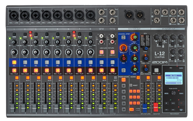 12 canais discretos (8 mono e 2 canais estéreo) com conectores XLR e 6,3 mm
