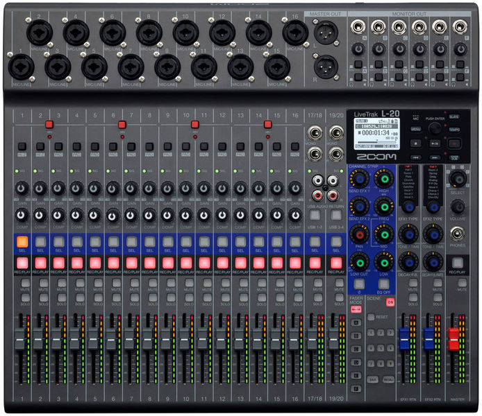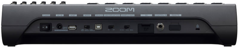 Mixer combinado, interface de áudio e gravador 20 canais discretos 16 mono e 2 canais estéreo com conectores de telefone XLR e 1/4 " Gravação simultânea de 22 faixas Reprodução de 20 faixas Interface de áudio USB com 22 entradas e 4 saídas Gravação de áudio de até 24 bits / 96 kHz em mídia de armazenamento SD Alimentação fantasma 48V Conectores Hi-Z (canais 1-2) Pad de 26 dB (canais 3 a 16) Compressor por canal com um botão (canais 1 a 16) Botões de solo e mudo para cada canal Corte baixo por canal entre 40 - 600 Hz ajustável de forma variável Total de saídas e seis saídas de monitor configuráveis As saídas do monitor podem ser configuradas como saída de fone de ouvido ou saída normal no nível da linha Saída de fone de ouvido separada adicional Função de memória para até nove cenas do mixer 20 chorus interno, editável, efeitos de delay e reverb Dois bicos de efeito Microfone de talkback integrado Função de pré-gravação Operação compatível com classe (para compatibilidade com iOS) Possibilidade de iniciar e parar automaticamente a gravação Importação e exportação de projetos via interface USB 2.0 Funções compatíveis com o pedal ZOOM FS01 Dimensões (L x P x A): 445 x 388,4 x 82,6 mm Peso: 3,71 kg Inclui fonte de alimentação (AD-19), cabo USB 2.0 e guia de início rápido